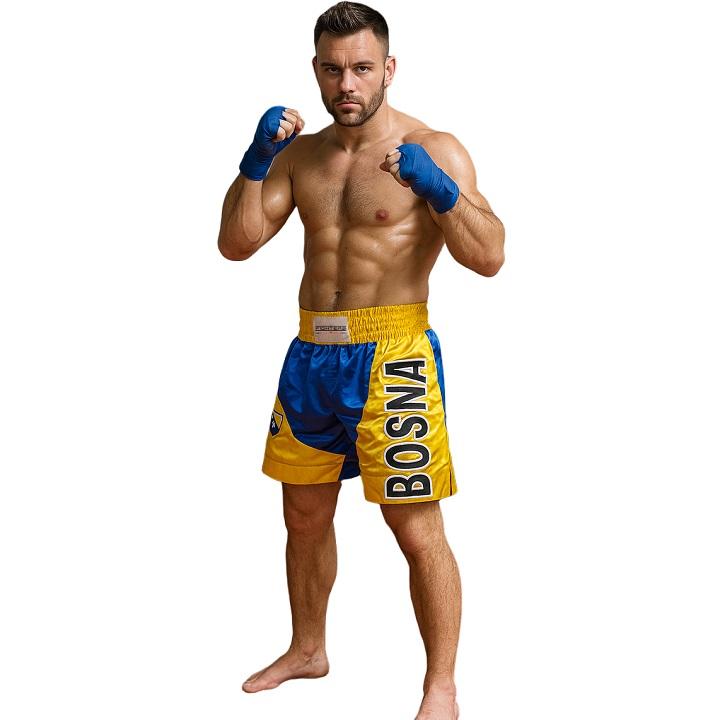 Kick-/Thaiboxing Shorts aus qualitativ hochwertigem edlem Satin. Hervorragende Verarbeitung (hand made). Gelb/Blaue Thai Hose mit Länder Wappen und BOSNA Schriftzug.Mit breitem elastischen Bund und seitlichen Schlitzen für perfekten Tragekomfort. Schnürung in der Innenseite. Spezieller Schnitt für High-Kicks und Kniestösse.