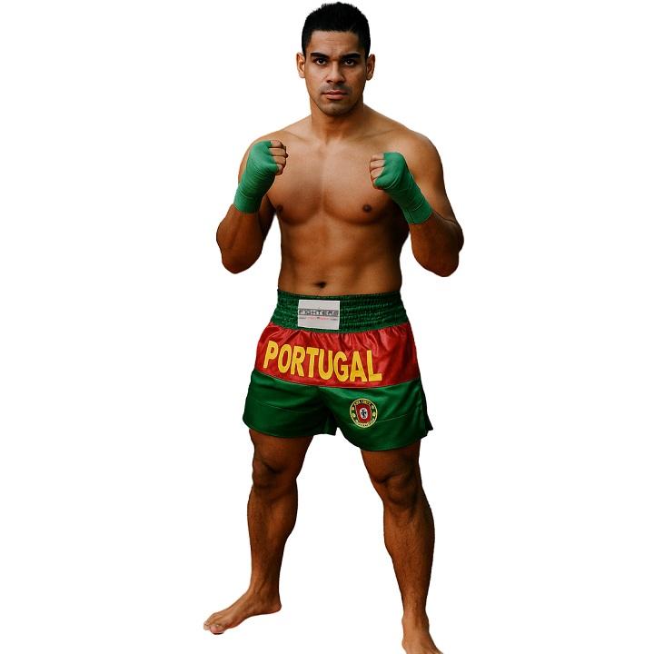 Kick-/Thaiboxing Shorts aus qualitativ hochwertigem edlem Satin. Hervorragende Verarbeitung (hand made). Grün/Rote Thai Hose mit Wappen aus Portugal und Portugal Schriftzug.Mit breitem elastischen Bund und seitlichen Schlitzen für perfekten Tragekomfort. Schnürung in der Innenseite. Spezieller Schnitt für High-Kicks und Kniestösse.